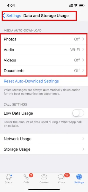 - تحت خيار تنزيل الوسائط تلقائيًا Media Auto-Download ستجد أنواع الوسائط التي يمكن تنزيلها تلقائيًا وهي الصور، والملفات الصوتية، ومقاطع الفيديو، والمستندات